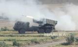 Kendaraan truk peluncur roket menembakkan sejumlah roket saat Latihan Gabungan Bersama (Latgabma) di Pusat Latihan Pertempuran Marinir (Puslatpurmar) 5 Baluran, Karangtekok, Situbondo, Jawa Timur, Senin (11/9/2023). (FOTO : AP Photo/Tatan Syuflana)