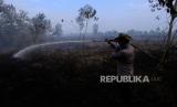Petugas kepolisian melakukan pembasahan di lokasi kebakaran lahan gambut di Desa Limbung, Kecamatan Sungai Raya, Kabupaten Kubu Raya, Kalimantan Barat, Senin (11/9/2023). Berdasarkan data BMKG pada 10 September 2023, dari hasil deteksi titik panas dengan menggunakan sensor VIIRS dan MODIS pada satelit polar (NOAA20, S-NPP, TERRA dan AQUA) yang memberikan gambaran lokasi wilayah yang mengalami kebakaran hutan dan lahan, terdapat 554 titik panas di Kalimantan Barat. (FOTO : Antara/Jessica Wuysang)