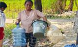 Warga Kampung Pabuaran, Desa Ciampea, Kecamatan Ciampea, Kabupaten Bogor mengantre mengambil air bersih yang didistribusikan Pemerintah Desa Ciampea, Selasa (12/9/2023). Selama dua bulan terakhir, hampir seluruh Desa Ciampea terdampak bencana kekeringan. (FOTO : Republika/ Shabrina Zakaria)