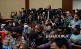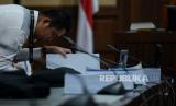 Jaksa penuntut umum bersiap membacakan tuntutan terhadap terdakwa Lukas Enembe saat menjalani sidang di Pengadilan Negeri Tipikor, Jakarta, Rabu (13/9/2023). Jaksa penuntut umum (JPU) KPK menuntut mantan Gubernur Papua itu dengan hukuman 10 tahun dan enam bulan penjara, denda Rp1 miliar subsider enam bulan kurungan dalam kasus suap dan gratifikasi senilai Rp46,8 miliar dalam proyek pembangunan infrastruktur di Provinsi Papua. Selain itu jaksa penuntut umum menjatuhkan pidana tambahan pada terdakwa untuk membayar uang pengganti Rp47,8 miliar. (FOTO : Republika/Thoudy Badai)