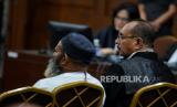 Terdakwa Lukas Enembe (kiri) menjalani sidang tuntutan di Pengadilan Negeri Tipikor, Jakarta, Rabu (13/9/2023). Jaksa penuntut umum (JPU) KPK menuntut mantan Gubernur Papua itu dengan hukuman 10 tahun dan enam bulan penjara, denda Rp1 miliar subsider enam bulan kurungan dalam kasus suap dan gratifikasi senilai Rp46,8 miliar dalam proyek pembangunan infrastruktur di Provinsi Papua. Selain itu jaksa penuntut umum menjatuhkan pidana tambahan pada terdakwa untuk membayar uang pengganti Rp47,8 miliar. (FOTO : Republika/Thoudy Badai)