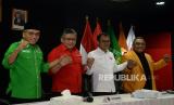Sekjen PPP Arwani Thomafi,Sekjen PDIP Hasto Kristiyanto, Sekjen Perindo Ahmad Rofiq dan Waketum Partai Hanura Benny Rhamdani (dari kiri) berfoto usai memberikan keterangan kepada wartawan di Gedung High End, Jakarta, Rabu (13/9/2023). Empat ketua umum partai politik pengusung bakal calon presiden (capres) Ganjar Pranowo menggelar rapat perdana yang membahas antara lain pemantapan Tim Pemenangan Nasional (TPN) dan agenda-agenda strategis lainnya (FOTO : Republika/Prayogi)