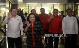 Ketua Umum PDIP Megawati Soekarnoputri didampingi Ketua Umum Partai Perindo Hary Tanoesoedibjo menyapa wartawan saat tiba untuk melakukan pertemuan di Gedung High End, Jakarta, Rabu (13/9/2023). Empat ketua umum partai politik pengusung bakal calon presiden (capres) Ganjar Pranowo menggelar rapat perdana yang membahas antara lain pemantapan Tim Pemenangan Nasional (TPN) dan agenda-agenda strategis lainnya (FOTO : Republika/Prayogi)