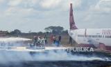 REPUBLIKA.CO.ID, PRAYA -- Petugas berupaya memadamkan api saat pesawat Tambora Air mengalami kecelakaan pada Latihan Penanggulangan Keadaan Darurat di Bandara Internasional Lombok, Praya, Lombok Tengah, NTB, Kamis (14/9/2023).