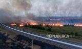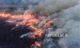 REPUBLIKA.CO.ID,OGAN ILIR -- Foto udara api membakar lahan di sisi gerbang tol Rambutan Jalan Tol Trans Sumatra (JTTS) ruas Palembang-Indralaya di Desa Sungai Rambutan, Indralaya Utara, Ogan Ilir (OI), Sumatera Selatan, Kamis (14/9/2023).