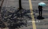 Warga berjalan di dekat bayangan pohon Tabebuya yang bunganya bermekaran di Jalan Jenderal Sudirman, Jakarta, Jumat (15/9/2023). Bunga dari pohon Tabebuya yang berasal dari Brazil itu bermekaran dan menambah keindahan kota. (FOTO : Republika/Putra M. Akbar)
