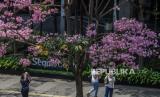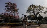 REPUBLIKA.CO.ID,JAKARTA -- Warga berjalan di dekat bunga tabebuya yang bermekaran di Jalan Jenderal Sudirman, Jakarta, Jumat (15/9/2023).
