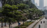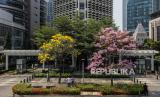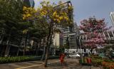 Deretan pohon Tabebuya yang bunganya mulai bermekaran di Jalan Jenderal Sudirman, Jakarta, Jumat (15/9/2023). Bunga dari pohon Tabebuya yang berasal dari Brazil itu bermekaran dan menambah keindahan kota. (FOTO : Republika/Putra M. Akbar)