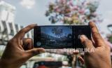 Warga memotret pohon Tabebuya yang bunganya bermekaran di Jalan Jenderal Sudirman, Jakarta, Jumat (15/9/2023). Bunga dari pohon Tabebuya yang berasal dari Brazil itu bermekaran dan menambah keindahan kota. (FOTO : Republika/Putra M. Akbar)