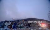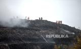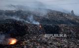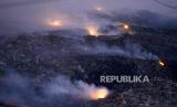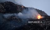 Kebakaran di Tempat Pembuangan Akhir (TPA) Putri Cempo, Mojosongo, Surakarta, Jawa Tengah, Ahad (17/9/2023) dini hari. Blok B TPA Putri Cempo terbakar pada Sabtu (16/9/2023) siang sekitar pukul 13.00 WIB yang dipicu oleh cuaca panas yang tinggi menyebabkan tumpukan gas metana terbakar. Pemadaman dilakukan secara gabungan yang melibatkan petugas pemadam kebakaran dari DIY dan Kabupaten lain di Jawa Tengah. Hingga Ahad (17/9/2023) beberapa titik api dan kepulan asap tebal masih terlihat di lokasi kebakaran. (FOTO : Republika/Wihdan Hidayat)