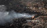 Petugas pemadam kebakaran gabungan memadamkan kebakaran di Tempat Pembuangan Akhir (TPA) Putri Cempo, Mojosongo, Surakarta, Jawa Tengah, Ahad (17/9/2023). Blok B TPA Putri Cempo terbakar pada Sabtu (16/9/2023) siang sekitar pukul 13.00 WIB yang dipicu oleh cuaca panas yang tinggi menyebabkan tumpukan gas metana terbakar. Pemadaman dilakukan secara gabungan yang melibatkan petugas pemadam kebakaran dari DIY dan Kabupaten lain di Jawa Tengah. Hingga Ahad (17/9/2023) beberapa titik api dan kepulan asap tebal masih terlihat di lokasi kebakaran. (FOTO : Republika/Wihdan Hidayat)