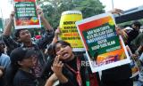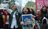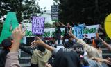 Puluhan massa yang terdiri dari remaja dan aktivis lingkungan mengangkat poster pada aksi Global Climate Strike 2023, di Taman Cikapayang, Jalan Ir H Djuanda, Kota Bandung, Ahad (17/9/2023). Aksi tersebut sebagai upaya mengajak masyarakat untuk perduli terhadap perubahan iklim dunia, agar melakukan tindakan nyata dalam mengatasinya. (FOTO : Edi Yusuf/Republika)