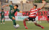 REPUBLIKA.CO.ID, BANGKALAN -- Kesebelasan sepak bola Madura melawan Persebaya pada pertandingan BRI Liga 1 di Stadion Gelora Bangkalan, Bangkalan, Jawa Timur, Ahad (17/9/2023).