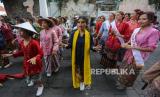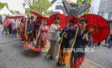 Sejumlah peserta menari mengenakan busana kebaya saat mengikuti parade milenial berkebaya dalam acara Festival Kota Lama 2023 di Taman Garuda Kota Lama, Semarang, Jawa Tengah, Ahad (17/9/2023). Parade perempuan berkebaya peranakan yang diikuti ratusan pelajar Kota Semarang dan enam pelajar internasional tersebut sebagai upaya mengenalkan serta melestarikan salah satu busana khas Indonesia kepada generasi muda. (FOTO : ANTARA FOTO/Makna Zaezar)