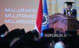 Rektor Universitas Islam Bandung (Unisba), Prof Edi Setiadi menyampaikan sambutan saat Pelantikan dan Taaruf Mahasiswa Baru Tahun Akademik 2023/2024, di Aula Unisba, Jalan Tamansari, Kota Bandung, Senin (18/9). Di depan lebih dari 2.000 mahasiswa baru Unisba, rektor berpesan bahwa tujuan dari sebuah perjalanan akademik bukan sebatas diperolehnya gelar akademik saja, namun yang tidak kalah pentingnya adalah dicapainya kompetensi akademik yang mencakup aspek pengetahuan kognitif, keterampilan, sikap serta karakter dan kepribadian berakhlakul karimah. (FOTO : Edi Yusuf/Republika)