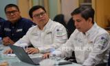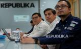 Direktur Utama PT Bank Muamalat Indonesia Tbk, Indra Falatehan (kiri) Sekretaris Perusahaan PT Bank Muamalat Indonesia Tbk, Hayunaji (tengah) dan jajaran direksi lainnya saat berkunjung ke kantor Republika, Jakarta, Senin(18/9/2023). Kunjungan tersebut merupakan agenda silaturahmi antara jajaran direksi Bank Muamalat bersama Redaksi Republika sekaligus membahas tentang program dan target Bank Muamalat. (FOTO : Republika/Thoudy Badai)