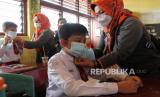 REPUBLIKA.CO.ID, PADANG -- Sejumlah petugas dari Kelompok Siaga Bencana (KSB) Srikandi Kota Padang memasangkan masker kepada murid Sekolah Dasar Negeri (SDN) 01 Alang Laweh di Padang, Sumatra Barat, Senin (18/9/2023).