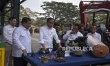 Presiden Joko Widodo (kedua kiri) didampingi Menteri Pertahanan Prabowo Subianto (kiri), Direktur Utama PT Pindad Abraham Mose (kedua kanan) melihat inovasi dan alat utama sistem pertahanan (alutsista) yang dipamerkan saat kunjungan ke Kantor Pusat PT Pindad, Kota Bandung, Jawa Barat, Selasa (19/9/2023). Dalam kunjungannya, Presiden Joko Widodo berkesempatan untuk meninjau fasilitas produksi alat utama sistem pertahanan (Alutsista) milik PT Pindad sebagai bentuk atensi dan apresiasi secara khusus terhadap PT Pindad sebagai industri pertahanan dalam negeri. (FOTO : ABDAN SYAKURA/REPUBLIKA)