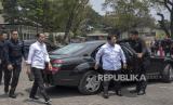 Presiden Joko Widodo (kedua kiri) bersama Menteri Pertahanan Prabowo Subianto (kedua kanan) turun dari mobil untuk menyapa sejumlah karyawan usai kunjungan ke Kantor Pusat PT Pindad, Kota Bandung, Jawa Barat, Selasa (19/9/2023). Dalam kunjungannya, Presiden Joko Widodo berkesempatan untuk meninjau fasilitas produksi alat utama sistem pertahanan (Alutsista) milik PT Pindad sebagai bentuk atensi dan apresiasi secara khusus terhadap PT Pindad sebagai industri pertahanan dalam negeri. (FOTO : ABDAN SYAKURA/REPUBLIKA)