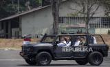 Presiden Joko Widodo (kedua kiri) bersama Menteri Pertahanan Prabowo Subianto (kiri) menaiki kendaraan taktis Maung Pindad saat kunjungan ke Kantor Pusat PT Pindad, Kota Bandung, Jawa Barat, Selasa (19/9/2023). Dalam kunjungannya, Presiden Joko Widodo berkesempatan untuk meninjau fasilitas produksi alat utama sistem pertahanan (Alutsista) milik PT Pindad sebagai bentuk atensi dan apresiasi secara khusus terhadap PT Pindad sebagai industri pertahanan dalam negeri. (FOTO : ABDAN SYAKURA/REPUBLIKA)
