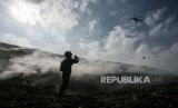 REPUBLIKA.CO.ID, SOLO. -- Petugas Pemadam Kebakaran mengamati helikopter BNPB menumpahkan air untuk memadamkan kebakaran tumpukan sampah di TPA Putri Cempo, Solo, Jawa Tengah, Selasa (19/9/2023).