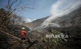 Petugas Pemadam Kebakaran berusaha memadamkan sisa api yang masih membakar tumpukan sampah sebelum dilakukan water bombing dengan helikopter di TPA Putri Cempo, Solo, Jawa Tengah, Selasa (19/9/2023). Badan Nasional Penanggulangan Bencana (BNPB) dan Pemkot Solo menggunakan metode water bombing untuk memadamkan kebakaran TPA Putri Cempo dengan helikopter Super Puma yang mampu mengangkut empat ribu liter air. (FOTO : ANTARA FOTO/Mohammad Ayudha)