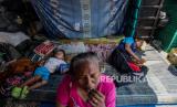 Sejumlah warga Kampung Bayam saat tidur di tenda hunian darurat di depan pintu masuk Jakarta International Stadium (JIS), Jakarta, Rabu (20/9/2023). Sebanyak 11 Kepala Keluarga (KK) yang sudah bertahan selama 10 bulan di tenda hunian darurat akibat belum bisa menempati Kampung Susun Bayam tersebut rencananya akan direlokasi ke Rusun Nagrak oleh Pemerintah Provinsi DKI Jakarta untuk pembangunan trotoar jelang perhelatan Piala Dunia U-17. (FOTO : Republika/Putra M. Akbar)