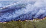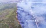 REPUBLIKA.CO.ID, OGAN ILIR. -- Foto udara api membakar lahan di sisi Jalan Tol Trans Sumatra (JTTS) ruas Palembang-Indralaya Km 08 Desa Sukarami, Kecamatan Pemulutan, Kabupaten Ogan Ilir (OI), Sumatra Selatan, Rabu (20/9/2023).