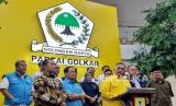 REPUBLIKA.CO.ID, JAKARTA -- Sekjen Partai Golkar Lodewijk Freidrich Paulus (tengah) bersama Sekjen Partai PAN Eddy Soeparno (kedua kanan), Sekjen Partai Gelora Mahfuz Sidik (kedua kiri), Sekjen Partai PBB Afriansyah Noor (kedua kiri belakang), Sekjen Garuda Yohanna Murtika (tengah belakang), dan jajaran pengurus partai menjawab pertanyaan wartawan seusai pertemuan di DPP Golkar, Jakarta, Rabu (20/9/2023).