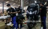 Pekerja saat menyelesaikan perakitan motor listrik di PT Terang Dunia Internusa Plant II, Citereup, Kabupaten Bogor, Jawa Barat, Kamis (21/9/2023). PT Terang Dunia Internusa atau United Bike mulai fokus memproduksi motor dan sepeda listrik dengan menargetkan kapasitas produksi sebanyak 500.000 unit per tahun sebagai upaya mendukung pengurangan emisi karbon. (FOTO : Republika/Putra M. Akbar)