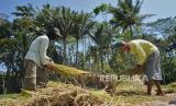 Warga merontokkan padi saat panen di persawahan Desa Kalibanger, Jumo, Temanggung, Jateng, Kamis (21/9/2023). Saat ini harga gabah kering mencapai Rp7.800-Rp8.000 per klogram, naik dari harga sebelumnya Rp5.500-Rp6.000 per kilogram di tingkat petani yang dipicu kelangkaan tanaman padi akibat kemarau. (FOTO : Antara/Anis Efizudin )