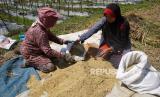 Warga mengumpulkan gabah saat panen di persawahan Desa Kalibanger, Jumo, Temanggung, Jateng, Kamis (21/9/2023). Saat ini harga gabah kering mencapai Rp7.800-Rp8.000 per klogram, naik dari harga sebelumnya Rp5.500-Rp6.000 per kilogram di tingkat petani yang dipicu kelangkaan tanaman padi akibat kemarau. (FOTO : Antara/Anis Efizudin )