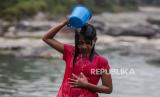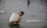 Seorang anak membawa jeriken berisi air dari aliran Kali Cileungsi di Desa Gunung Sari, Kabupaten Bogor, Jawa Barat, Kamis (21/9/2023). Sudah dua bulan warga setempat memanfaatkan aliran Kali Cileungsi untuk kegiatan mandi, cuci dan kakus (MCK). Hal tersebut diakibatkan air sumur di rumah mereka sudah mengalami kekeringan dampak dari kemarau yang berkepanjangan. (FOTO : Republika/Putra M. Akbar)
