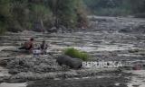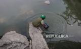 Seorang warga mengambil air dari aliran Kali Cileungsi di Desa Gunung Sari, Kabupaten Bogor, Jawa Barat, Kamis (21/9/2023). Sudah dua bulan warga setempat memanfaatkan aliran Kali Cileungsi untuk kegiatan mandi, cuci dan kakus (MCK). Hal tersebut diakibatkan air sumur di rumah mereka sudah mengalami kekeringan dampak dari kemarau yang berkepanjangan. (FOTO : Republika/Putra M. Akbar)
