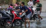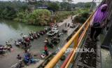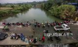 Sejumlah warga mencuci motor menggunakan air dari aliran Kali Cileungsi di Desa Gunung Sari, Kabupaten Bogor, Jawa Barat, Kamis (21/9/2023). Sudah dua bulan warga setempat memanfaatkan aliran Kali Cileungsi untuk kegiatan mandi, cuci dan kakus (MCK). Hal tersebut diakibatkan air sumur di rumah mereka sudah mengalami kekeringan dampak dari kemarau yang berkepanjangan. (FOTO : Republika/Putra M. Akbar)
