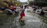 Warga menyiram kepalanya menggunakan air dari aliran Kali Cileungsi di Desa Gunung Sari, Kabupaten Bogor, Jawa Barat, Kamis (21/9/2023). Sudah dua bulan warga setempat memanfaatkan aliran Kali Cileungsi untuk kegiatan mandi, cuci dan kakus (MCK). Hal tersebut diakibatkan air sumur di rumah mereka sudah mengalami kekeringan dampak dari kemarau yang berkepanjangan. (FOTO : Republika/Putra M. Akbar)