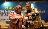 Ketua Asosiasi Lembaga Pemeriksa Halal Indonesia (ALPHI) Elvina A Rahayu (kiri) berbincang dengan Asisten Deputi Moderasi Beragama Kementerian Koordinator Bidang Pembangunan Manusia dan Kebudayaan (Kemenko PMK) Thomas Siregar (kiri) disela acara Forum Group Discussion (FGD) dan workshop di Jakarta, Kamis (21/9/2023). FGD dan Workshop yang diselenggarakan oleh Asosiasi Lembaga Pemeriksa Halal Indonesia (ALPHI) ini mengangkat tema Bersinergi Memperkuat Regulasi Ekosistem Halal Untuk Perlindungan Konsumen Muslim. Tema ini ambil dalam rangka menyatukan langkah para stakeholder yang ada dalam rangkaian proses sertifikasi halal di Indonesia. (FOTO : Republika/Prayogi)