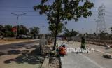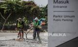 Pekerja membuat median jalan di depan Jakarta International Stadium (JIS), Jakarta, Jumat (22/9/2023). Dinas Bina Marga DKI Jakarta menargetkan perbaikan trotoar, meninggikan jalan hingga pemasangan lampu di depan Jakarta International Stadium (JIS) akan selesai pada Oktober 2023 sebelum perhelatan Piala Dunia U-17. (FOTO : Republika/Putra M. Akbar)