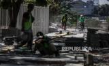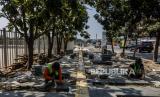 Pekerja memotong paving blok untuk perbaikan trotoar di depan Jakarta International Stadium (JIS), Jakarta, Jumat (22/9/2023). Dinas Bina Marga DKI Jakarta menargetkan perbaikan trotoar, meninggikan jalan hingga pemasangan lampu di depan Jakarta International Stadium (JIS) akan selesai pada Oktober 2023 sebelum perhelatan Piala Dunia U-17. (FOTO : Republika/Putra M. Akbar)
