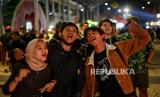 Pengunjung berfoto di area gelaran Pestapora di JIExpo Kemayoran, Jakarta, Jumat (22/9/2023). Festival musik bertajuk Pestapora kembali digelar untuk kedua kalinya di Gambir Expo dan JIExpo Kemayoran mulai hari ini Jumat (22/9) hingga ahad (24/9). Pada gelaran kali ini, pestapora menghadirkan sebanyak 12 panggung dan 224 penampil diantaranya musisi, band hingga stand up comedy. (FOTO : Republika/Thoudy Badai)