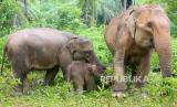 REPUBLIKA.CO.ID, WOYLA TIMUR -- Seekor bayi gajah sumatera (Elephas maximus sumatrensis) berada di dekat kaki induknya di kawasan Conservation Response Unit (CRU) Desa Alue Kuyun, Woyla Timur, Aceh Barat, Aceh, Sabtu (23/9/2023).