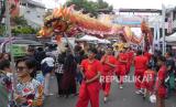 Penampilan kesenian liong saat acara Cibadak Fun Day di Jalan Cibadak Lama, Kota Bandung, Sabtu (23/9/2023). (FOTO : Edi Yusuf/Republika)
