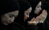 Peserta memanjatkan doa usai mendengarkan paparan ustadzah Dunia Shuaib bersama Ustadzah Oki Setiana Dewi dalam seminar yang diselenggarakan oleh Indonesia Syiar Network (ISN) dengan tema Healing Emotion Practical Guide to Overcome Anxiety and Fear di CGV Grand Indonesia, Jakarta, Sabtu (23/9/2023). Dalam Seminar tersbut ustadzah Dunia Shuaib dan Ustadazh Oki menyampaikan pesan terkait prespektif islam, Al-Quran, Hadits dan Psikologi Islam dalam memandang persoalan mental healt. (FOTO : Republika/Thoudy Badai)