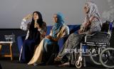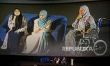 Ustadzah Dunia Shuaib (kiri) bersama Ustadzah Oki Setiana Dewi (tengah) saat mengisi seminar yang diselenggarakan oleh Indonesia Syiar Network (ISN) dengan tema Healing Emotion Practical Guide to Overcome Anxiety and Fear di CGV Grand Indonesia, Jakarta, Sabtu (23/9/2023). Dalam Seminar tersbut ustadzah Dunia Shuaib dan Ustadazh Oki menyampaikan pesan terkait prespektif islam, Al-Quran, Hadits dan Psikologi Islam dalam memandang persoalan mental healt. (FOTO : Republika/Thoudy Badai)