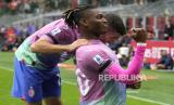Rafael Leao dari AC Milan melakukan selebrasi bersama Christian Pulisic setelah mencetak gol pada pertandingan sepak bola Serie A antara AC Milan dan Hellas Verona di stadion San Siro di Milan, Italia, Sabtu, (23/9/2023). (FOTO : AP Photo/Luca Bruno)