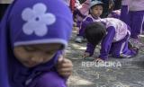 Sejumlah anak mewarnai aspal pada Tamansari Street Festival di Jalan Sulanjana, Kota Bandung, Jawa Barat, Ahad (24/9/2023). Acara yang diisi dengan berbagai kegiatan seperti mewarnai aspal, bazar UMKM, karnaval dan pertunjukkan seni tersebut digelar untuk memeriahkan Hari Jadi ke-213 Kota Bandung. (FOTO : ABDAN SYAKURA/REPUBLIKA)