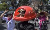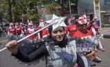 Warga mengenakan kostum mengikuti karnaval pada Tamansari Street Festival di Jalan Ir H Juanda, Kota Bandung, Jawa Barat, Ahad (24/9/2023). Acara yang diisi dengan berbagai kegiatan seperti mewarnai aspal, bazar UMKM, karnaval dan pertunjukkan seni tersebut digelar untuk memeriahkan Hari Jadi ke-213 Kota Bandung. (FOTO : ABDAN SYAKURA/REPUBLIKA)
