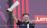 Kepala tim Red Bull Christian Horner merayakan saat memenangi gelar konstruktor di podium usai Grand Prix Formula Satu Jepang di Sirkuit Suzuka, Suzuka, Jepang tengah, Ahad, (24/9/2023). (FOTO : AP Photo/Toru Hanai)