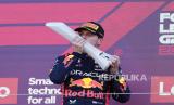 Pembalap Formula Satu Belanda Max Verstappen dari Red Bull Racing mencium trofi usai menjuarai Grand Prix Formula Satu Jepang di arena pacuan kuda Sirkuit Suzuka di Suzuka, Jepang, Ahad (24/9/2023). (FOTO : EPA-EFE/FRANCK ROBICHON)