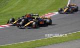 Pembalap Belanda Max Verstappen (Kiri) dari Red Bull Racing, pembalap Inggris Lando Norris (tengah) dari Tim F1 McLaren dan pembalap Australia Oscar Piastri dari Tim F1 McLaren beradu kecepatan ditikungan saat Grand Prix Formula Satu Jepang di arena pacuan kuda Sirkuit Suzuka di Suzuka, Jepang , Ahad (24/9/2023). (FOTO : EPA-EFE/FRANCK ROBICHON)